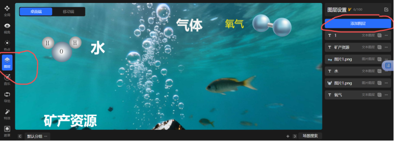 技术方案采用720云网站构建3D动态海洋场景,并插入海面深入海底的动画衔接,并在海底图植入气体、水、碳酸钙等20种海洋常见物质3D模型,模型点击后可显示组成元素及原子结构。