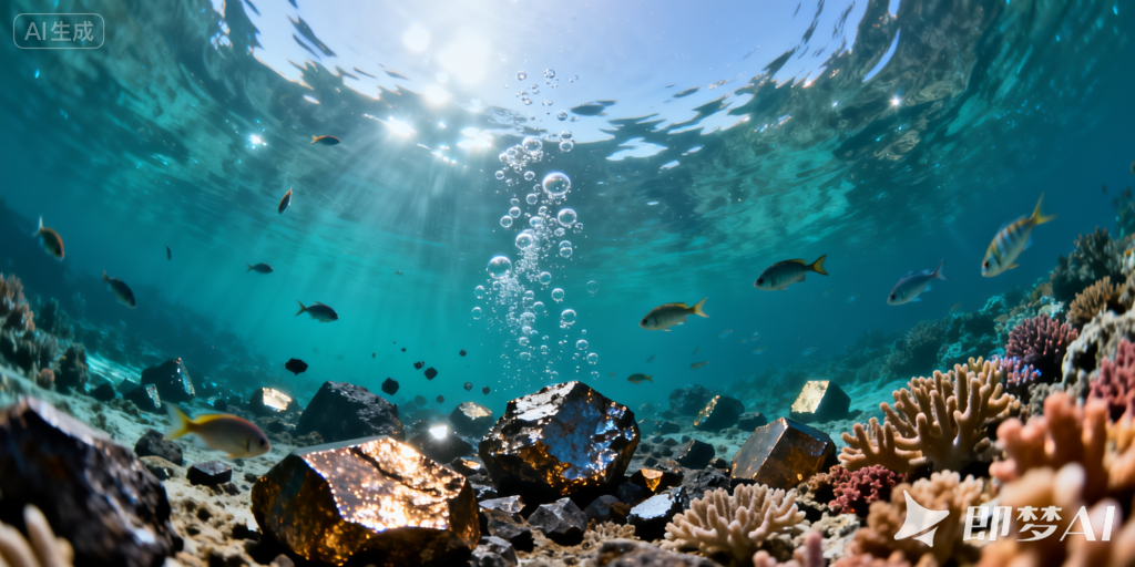2.用即梦制作动画:输入“360度全景,俯拍视角,从海洋水面往海底深入,进入海底,海底中有鱼,有珊瑚,有矿石,有气泡,最终停止在海底画面10秒”