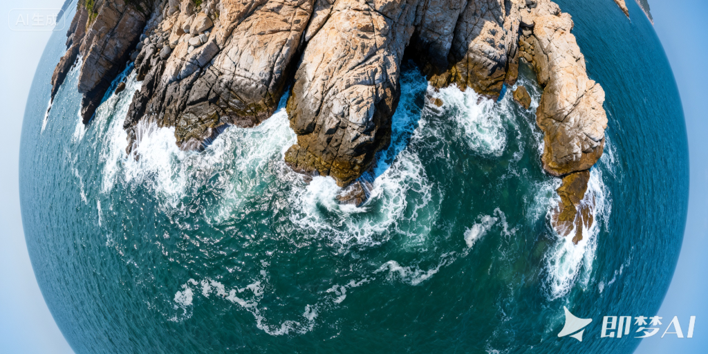 1.用即梦制作全景图:输入“创设一张海洋的图片,海水拍打海岸礁石的俯视画面,鱼眼镜头,720度全景图”图片4.0,像素2592:1296,2K